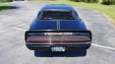 The car is finished in black and features a “screaming chicken” hood decal and gold striping. Additional features include front fender vents, quad headlamps, chrome drip rails, a shaker hood, front and rear spoilers, and quad angled exhaust tips. The seller notes that an area of the left rear quarter panel has been repainted.