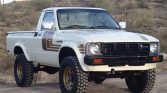 This 1979 Toyota pickup is finished in white with tri-color accents over a tan vinyl interior and is powered by a carbureted 2.2-liter inline-four paired with a four-speed manual transmission and two-speed transfer case. Equipment includes air conditioning, a sliding rear window, power steering, a sunroof, and an AM/FM radio.
