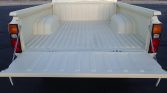 The truck is finished in white with three-color graphics on the doors, front fenders, and hood. The rear bumper has been removed, and exterior features include a a sliding rear window, an aftermarket dual-panel sunroof, and a spray-in bedliner.