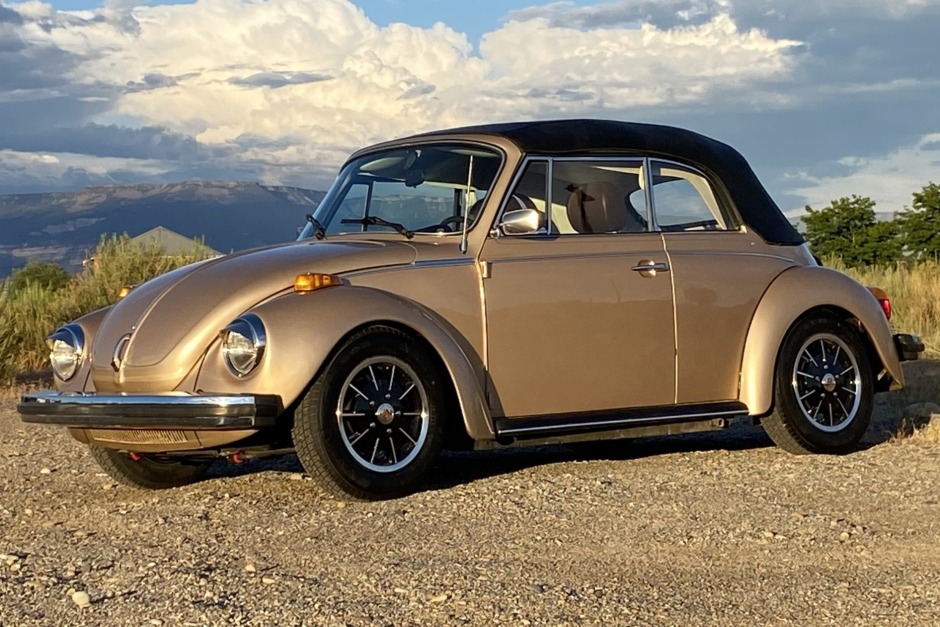This 1979 Volkswagen Super Beetle convertible is a Canadian-market example that was imported into the US and spent time in Washington State before relocating to Colorado, where it was acquired by the seller in 2020. The car is finished in gold with a padded black soft top over a brown vinyl interior and is powered by a fuel-injected 1.6-liter flat-four paired with a four-speed manual transaxle. Modifications performed under current ownership have included a five-lug conversion as…