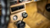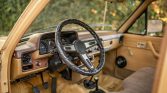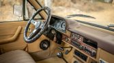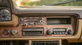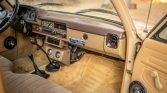 The cabin is upholstered in tan and the bench seat has been retrimmed in textured cloth. Amenities include a sliding rear window, a map pocket, and an AM/FM radio. Both the horn and the ammeter are broken.
