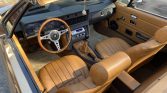 The car was delivered from the factory with Golden Tan Check (RAG) upholstery, and during current ownership the cabin was reupholstered with saddle seating surfaces, door panels and Wilton wool carpets. A Sony stereo has been fitted in the stock location, and a three-spoke Moto Lita steering wheel fronts the factory instrument binnacle. Shoulder belts are equipped for both occupants, and discoloration is visible on the sun visors.