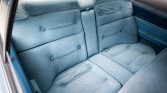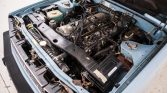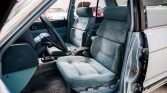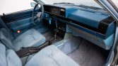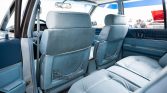 The cabin features pillowed blue upholstery on the front bucket and rear bench seats as well as color-matched carpets and two-tone dash and door trim. Amenities include power windows and locks, a stock cassette stereo, air conditioning, and a digital clock. The cruise control system is inoperative.