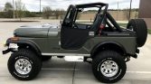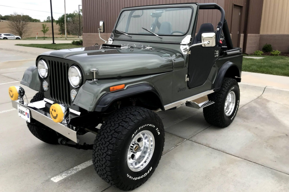 This 1981 Jeep CJ-5 was modified approximately 12 years ago, including a repaint in metallic green and the installation of an overbored 360ci AMC V8 that is paired with a four-speed manual transmission and a dual-range transfer case. The seller purchased it in 2020 and subsequently added off-road lights, a custom sound system, Bestop seats, Pro Comp wheels, and Bestop half-doors. Other features include Holley fuel injection, front and rear Detroit lockers, and an onboard air compressor. Service performed in preparation for the sale is said to have included changing the oil, transmission fluid, and transfer case fluid, as well as replacing the spark plugs and wires.