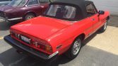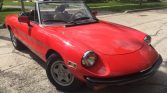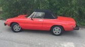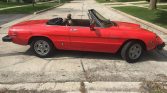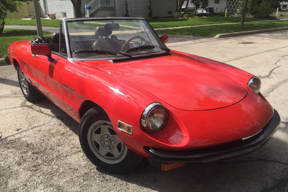 This 1982 Alfa Romeo Spider is finished in red over brown upholstery and is powered by a 2.0-liter twin-cam inline-four paired with a five-speed manual transmission. Equipment includes 14″ Campagnolo wheels, a limited-slip differential, a black soft top, power windows, a wood-rimmed steering wheel, and a Sony cassette stereo. Work reportedly included lower-body rust repair, brake service, installation of an electronic ignition system, and replacement of the alternator, battery, spark plugs, tires, and fluids.