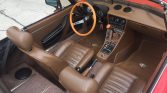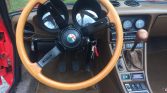 The interior features brown upholstery on the bucket seats and door panels as well as matching loop carpets and dash surfaces. Equipment includes adjustable head rests, a wood-rimmed steering wheel, power windows, a Sony cassette stereo, and Alfa Romeo-branded floor mats.