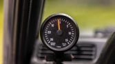 The leather-wrapped MOMO steering wheel frames an 85-mph speedometer and a tachometer along with gauges for fuel level and coolant temperature, and a VDO gauge displaying boost pressure is affixed to the left side of the dashboard. The six-digit mechanical odometer shows 29k miles.