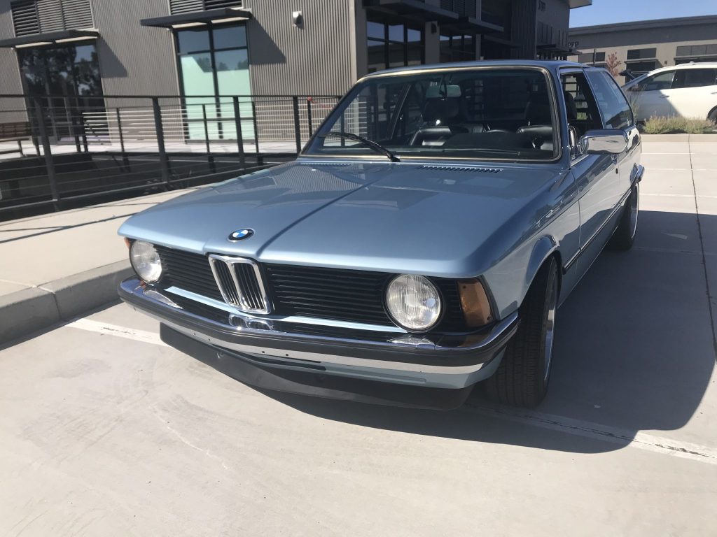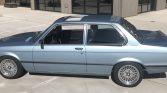 This 1982 BMW 320i was modified during previous ownership with a carbureted Buick 215ci V8 and a Tremec T-5 five-speed manual transmission. The car is finished in light blue over a black interior and is equipped with a limited-slip differential, adjustable coilovers, front and rear spoilers, Euro-spec bumpers, a Kenwood stereo, aftermarket 15″ mesh wheels, and a sunroof.