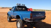 The truck is finished in Medium Blue and features silver graphics, chrome mirrors, and Toyota-branded mud flaps. Equipment includes a body-color visor and Bushwacker wheel arch flares, a roll bar with six KC HiLites, a winch, a coil antenna, tow hooks, Locktup front and rear bumpers, recovery track boards, a high-lift jack, and a bed liner.