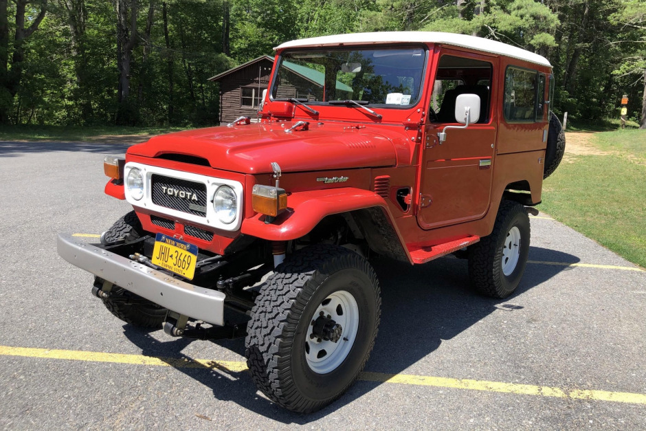 This 1982 Toyota Land Cruiser BJ42 is a left-hand-drive example that was imported into the US in the early 1990s from British Columbia, Canada, and has since spent time in Connecticut and New York. The truck is finished in red over gray and is powered by a 3.4-liter diesel inline-four paired with a four-speed manual transmission and a dual-range transfer case. Equipment includes an Aqualu aluminum tub, rear jump seats, locking front hubs, a cabin heater, a Tuffy center console, an aftermarket Pioneer stereo, an HFS 4″ lift, and a receiver hitch.