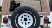 White-finished 15″ steel wheels are mounted with 33×12.5″ Mickey Thompson Baja Legend EXP tires, while a matching spare is housed on the swing-away rear carrier. The seller notes that the spare tire contacts the body when the carrier is fully open. The truck is equipped with manually locking front hubs, power steering, and front disc brakes. A 4″ suspension lift kit is fitted and features Skyjacker steering dampers and shock absorbers.