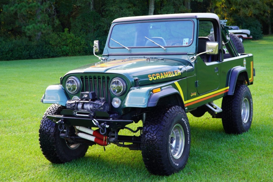 The Scrambler was introduced as a long-wheelbase pickup version of the CJ-7 for the 1981 model year, and this example was repainted green under prior ownership. Equipment includes a cab hardtop, half doors with soft uppers, aftermarket front and rear bumpers, LED headlights, a 9,500lb-rated Smittybilt winch with synthetic rope, recovery shackles, and a swing-away spare tire carrier.