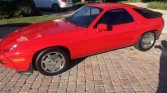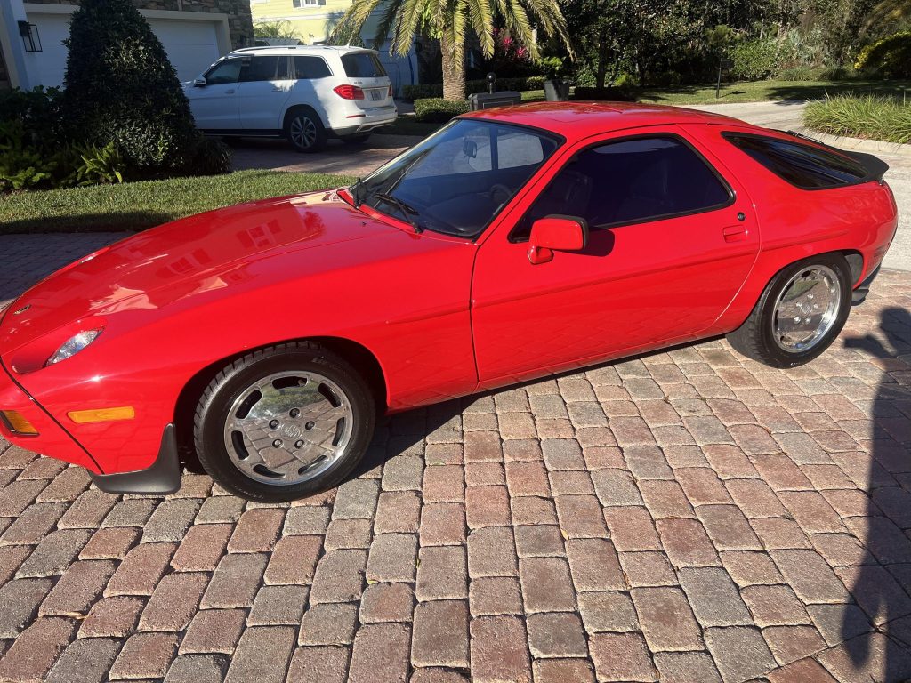 This 1983 Porsche 928S is powered by a 4.7-liter V8 paired with a five-speed manual transaxle, and it is finished in Guards Red over black leather upholstery. Equipment includes 16″ Flat Disc wheels, a sunroof, power-adjustable front seats, pop-up headlights, fog lights, and a Blaupunkt Monterey cassette stereo. Service under current ownership has included replacing the water pump, battery, and engine belts.