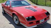This 1984 Chevrolet Camaro Z28 was sold new at Davis Chevrolet-Cadillac in Gillette, Wyoming, and was acquired by the seller’s grandfather in 1999. The car is finished in red over gray cloth and is powered by a 5.0-liter V8 paired with a four-speed automatic transmission. Features include removable glass T-tops, 15″ alloy wheels, air conditioning, cruise control, power windows and door locks, and a factory cassette stereo with an equalizer.