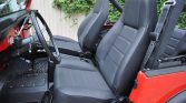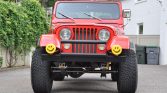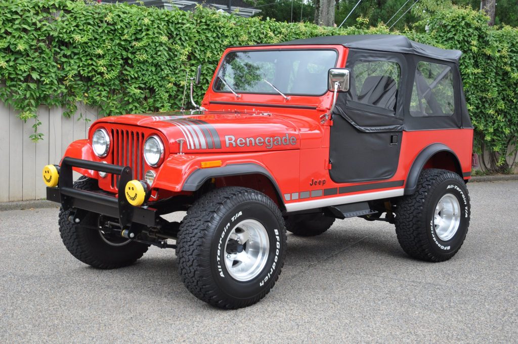 The truck received rust repairs, replacement body mounts, and a repaint in red under previous ownership. Exterior features include Renegade decals with gray stripes, black plastic fender flares, a replacement soft top, LED headlight bulbs, KC Daylighter LED auxiliary lights, a replacement rear bumper, and front push bar.