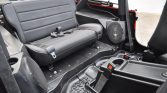 The interior is fitted with replacement front and rear seats upholstered in black vinyl along with floors coated in POR-15 protective paint. Amenities include a Pioneer Bluetooth stereo with a four-channel amplifier, Kenwood speakers, fitted rubber floor mats, and a padded rollbar.