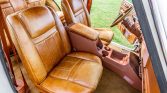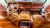 The cabin features replacement power-adjustable heated front seats upholstered in Almond brown and wood trim accents the steering wheel, dashboard, and door panels. Additional features include an Alpine head unit, an alarm system, and power windows, mirrors, and door locks. The air conditioning condenser is disabled and various hoses for the system are missing. A replacement rear passenger door locking mechanism was installed in preparation for the sale.