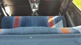 The Midnight Blue interior features bolstered cloth seats with red striped inserts, and equipment include a golf ball shift knob, an Alpine cassette stereo, and crank windows. The seller states the center console clock was converted to an oil-pressure gauge in April 2021. A replacement gauge cluster bezel and blue dashboard faceplate with red pinstripes are included in the sale, along with a matching fabric dashboard cover and a spare front seat bolster pad.