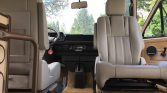 The cockpit features gray leather seats reportedly sourced from a Chrysler van along with tan carpets, rubber floor mats, a Blaupunkt head unit, and aftermarket door speakers.