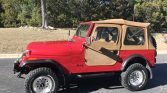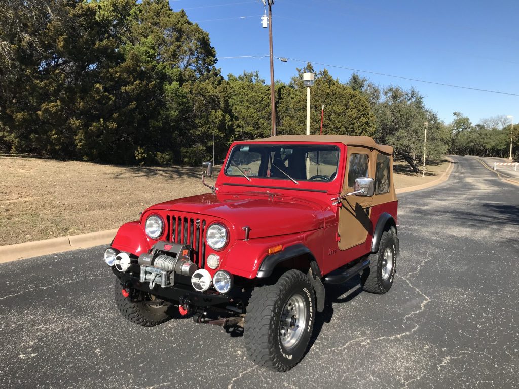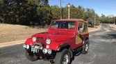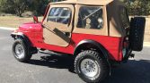 This 1985 Jeep CJ-7 is finished in red with a removable tan soft top and a matching interior, and power comes from a replacement 4.2-liter Jasper inline-six paired with a five-speed manual transmission and a dual-range transfer case. Modifications include Detroit Truetrac limited slip differentials, Howell fuel injection, a 2.5″ suspension lift, Warn bumpers, a front winch, aftermarket 15″ wheels, a CB radio, and a Panasonic stereo.