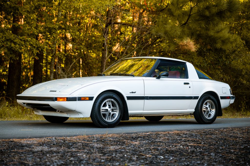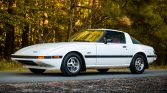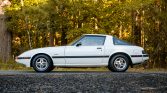 This 1985 Mazda RX-7 GS is finished in Dover White over a dark red interior and powered by a 1.1-liter rotary mated to a five-speed manual transmission. Equipment includes air conditioning, a cassette stereo, a sunroof, 13″ alloy wheels, mud flaps, and power mirrors.