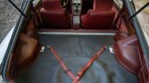 The cockpit features seats trimmed in patterned dark red cloth with a color-coordinated dashboard, console, carpets, and door panels. Equipment includes air conditioning, a digital clock, power mirrors, a rear window defogger, crank windows, and a factory cassette stereo. Records indicate the air-conditioning system was recharged in October 2021.