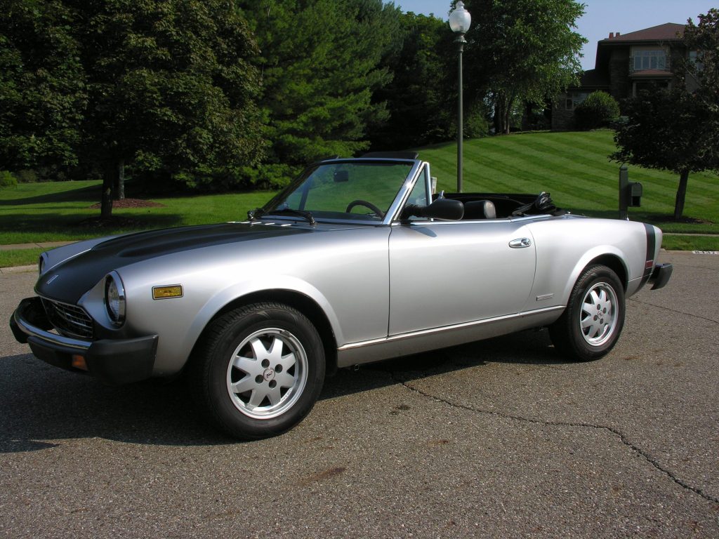 The 1985.5 Spider Europa was the final iteration of the Pininfarina Azzurra, built for the US market from late 1982 through 1985 after Fiat discontinued the 124 Spider in North America. This example is finished in silver and features a hood covered in satin black vinyl with a matching stripe at the rear. Additional exterior details include a black soft top, chrome impact bumpers, dual side mirrors, Pininfarina badging, and a twin-outlet Ansa exhaust.
