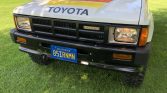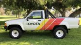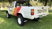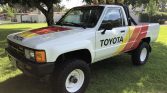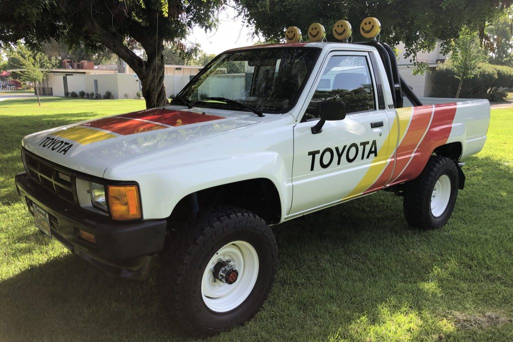 This 1985 Toyota Pickup 4×4 is finished in white with Ivan “Ironman” Stewart graphics over tan and is powered by a 2.4-liter inline-four paired with a five-speed manual transmission. The truck was acquired by the seller in 2019 and is said to have been refurbished with work including a repaint, an interior refresh, and replacement of the glass and weatherstripping. Equipment includes air conditioning, a roll bar, KC auxiliary lights, a Sony pull-out AM/FM/cassette stereo, and mudflaps. Maintenance in February 2021 consisted of a fluid flush, an air conditioning service, replacement of the spark plugs, and a carburetor rebuild.