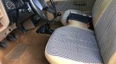 The cab features a bench seat reupholstered in tan vinyl with black and white houndstooth cloth inserts joined by a matching headliner, dashboard and door panels. Amenities include a Sony pull-out AM/FM/cassette stereo, air conditioning, and manual door locks and windows.