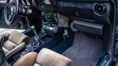 The interior features front and rear bolstered seats upholstered in brown cloth as well as contrasting black carpets and trim. Amenities include air conditioning, power windows, and an aftermarket Pioneer stereo.