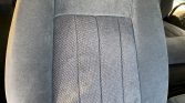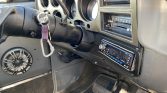 The cabin is upholstered in gray cloth with a matching dashboard, carpets, and door panels. Amenities include a locking center console, aluminum-look trim, air conditioning, power aLessories, and an aftermarket Clarion head unit paired with Polk Audio speakers installed in the door panels.