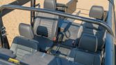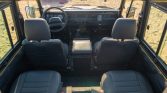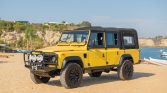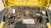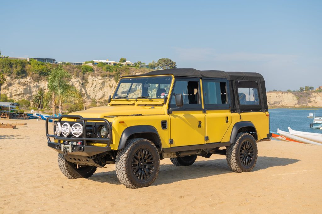 This 1986 Land Rover 110 is a left-hand drive conversion that is finished in satin yellow over black vinyl and was imported to the US during previous ownership. The truck is powered by a replacement Callaway-built 4.6-liter V8 paired that drives all four wheels through a four-speed automatic transmission and a dual-range transfer case. Features include power-assisted front disc brakes, power steering, a removable soft top, LED headlamps and turn signals, Hella Rallye 1000 lights, an XRC winch, a Puma-style hood, 18″ Khan wheels, aftermarket triple horns, Polk Audio speakers, and a Sony CD/Bluetooth stereo.