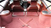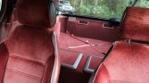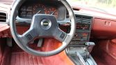 The seats are trimmed in maroon fabric and complemented by matching carpets and door panels. Amenities include air conditioning, cruise control, power windows and locks, and a factory cassette stereo with a graphic equalizer. Storage bins are located behind the front seats.