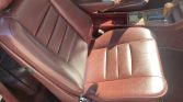 The cabin features seating surfaces trimmed in Medium Red leather (277) with a matching lower dashboard, door panels, and carpets. Amenities include heated and power-adjustable front seats with position memory, burl wood trim, central locking, cruise control, and a Becker Grand Prix cassette stereo.
