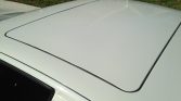 The body is finished in Alpine White and is equipped with pop-up headlamps, fog lights, an electric sunroof, a rear wiper, a black rear spoiler, and a single polished exhaust outlet. The seller has fitted Euro-style driving lights, and the rear badging has been removed. Clear chip guards are affixed to the rockers and the front of the rear fenders, and blemishes can be seen on the lower rocker panels.