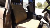 The cabin features seats trimmed in brown vinyl with striped tan cloth inserts, matching door panels, and brown carpeting. Equipment includes hand-crank windows, Tuffy center console lockbox with cup holders front and rear, and an Alpine CD stereo. The front seats were repaired in 2007, and the air-conditioning system was overhauled and converted to R-134a refrigerant.