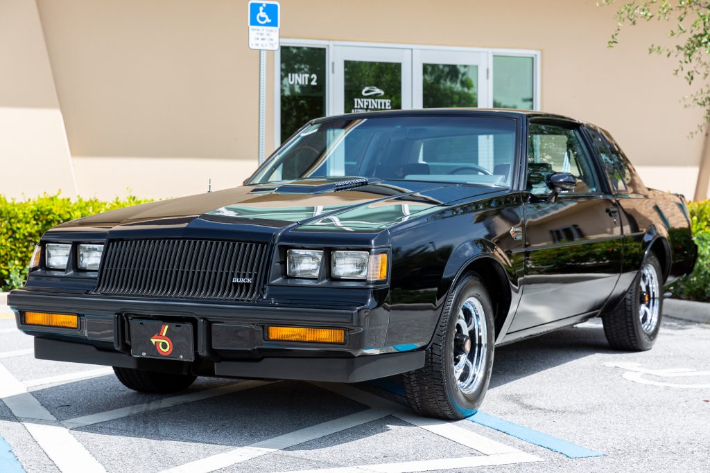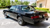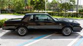The car is finished in black and equipped with a power-bulge hood, a front air dam, a rear spoiler, a body-color grille, and Grand National badging.