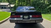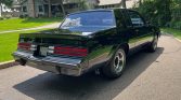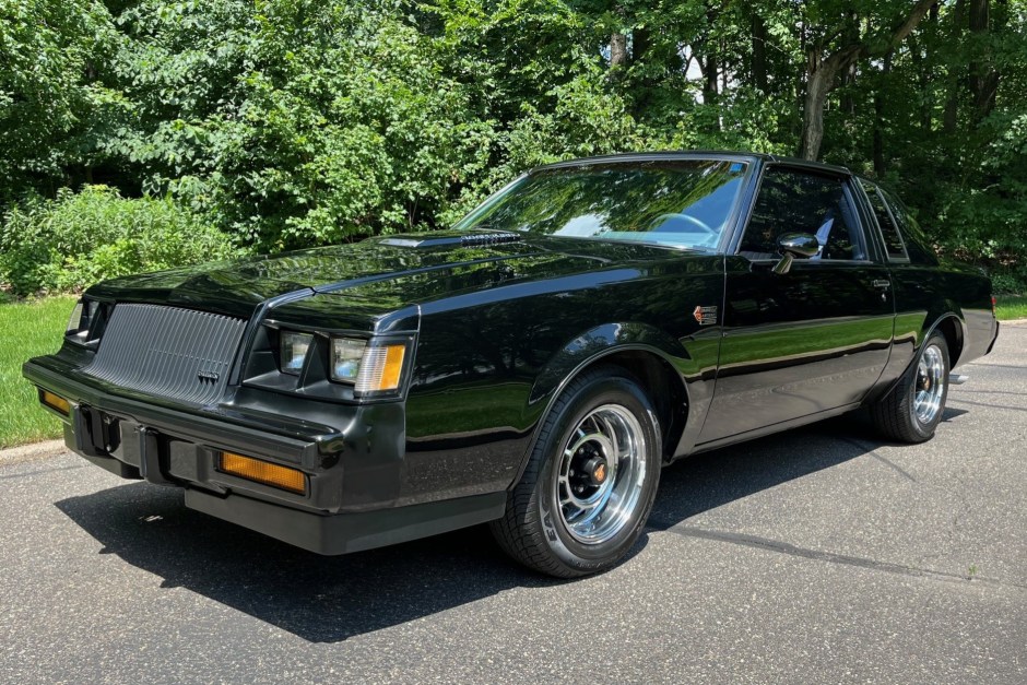 This 1987 Buick Grand National is powered by a turbocharged 3.8-liter V6 paired with a four-speed automatic transmission and finished in black over black and Sand Gray cloth. Equipment includes a limited-slip differential, 15″ chrome wheels, removable glass roof panels, a rear spoiler, a power-adjustable driver seat, air conditioning, cruise control, power windows, and a Delco AM/FM/cassette stereo.
