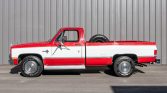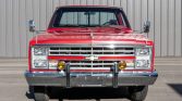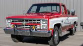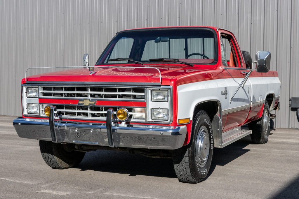 This 1987 Chevrolet R20 Silverado is a conventional-cab three-quarter-ton Fleetside pickup finished in Garnet Red Metallic with white accents over a burgundy interior, and power comes from a 454ci V8 mated with a three-speed automatic transmission. Equipment includes an eight-foot bed, cruise control, running boards, dual fuel tanks, chrome bumpers, 16″ wheels, and stainless-steel camper mirrors.