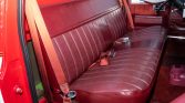 The bench seat is trimmed in burgundy upholstery with a matching upper dashboard and door panels, as well as a body-color painted lower dashboard. Brushed trim adorns the dashboard, instrument cluster, and door panels, and additional factory equipment includes air conditioning, a Delco AM/FM stereo, crank windows, and a sliding rear window. A red carpeted dashboard cover is fitted along with an aftermarket CB radio.