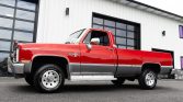 This 1987 Chevrolet V10 Silverado is a 4×4 Fleetside pickup is finished in red and gray over burgundy cloth and is powered by a 5.7-liter V8 linked with a four-speed automatic transmission and a dual-range transfer case. Additional equipment includes 15″ eight-hole wheels, front disc brakes, power steering, a front wind deflector, a sliding rear window, and running boards in addition to air conditioning, a cassette stereo, and power windows and locks.