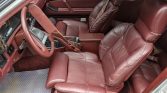 The cabin features bolstered seats upholstered in burgundy leather with a matching dashboard, center console, door panels, and carpets. Amenities include automatic climate control, cruise control, a cassette stereo with a graphic equalizer, power windows, and Turbo-branded automatic-retracting front seatbelts.