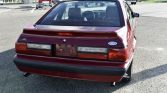 The car is finished in red and equipped with a rear spoiler, black trim strips, halogen headlights, wrap-around taillights, and polished dual exhaust outlets.