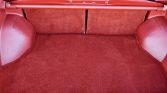 The cabin features seating surfaces upholstered in Scarlet Red cloth with a matching lower dashboard, center console, door panels, and carpets. Amenities include front seats with power-adjustable lumbar support and an aftermarket cassette stereo. Air conditioning equipment is present but the system will not hold a refrigerant charge.