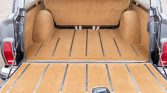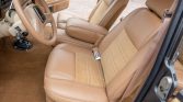 The cabin feature seating surfaces that have been re-trimmed in tan leather with corduroy inserts, matching door panels, replacement brown carpets, and a wood-trimmed dash. Amenities include power-adjustable front seats, electric windows, cruise control, air conditioning, and a Bluetooth-capable Sony stereo with USB and auxiliary inputs.