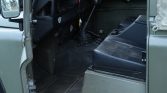 The right-hand-drive cab features twin front seats upholstered in black vinyl, and the inward-facing rear jump seats are upholstered in gray vinyl. Equipment includes dashboard vents, a center console with cupholders, two fire extinguishers, and rubber floor lining.