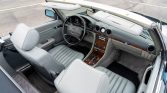 The cabin features bucket seats upholstered in gray leather along with a matching dashboard, center console, and door panels. Mercedes-Benz-branded rubber floor mats line the footwells, and appointments include automatic climate control, cruise control, a Becker Grand Prix AM/FM/cassette stereo, an alarm system, and power windows and locks. The air conditioning is said to have been converted to use R134a refrigerant.