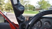 A three-spoke steering wheel frames an 85-mph speedometer, a tachometer with a 4,600-rpm redline, and gauges for oil pressure, engine temperature, voltage, and fuel level. Additional gauges have been mounted to the A-pillar, and a Holley Sniper EFI LCD touch-screen controller has been added ahead of the shifter levers. The six-digit odometer shows 146k miles.