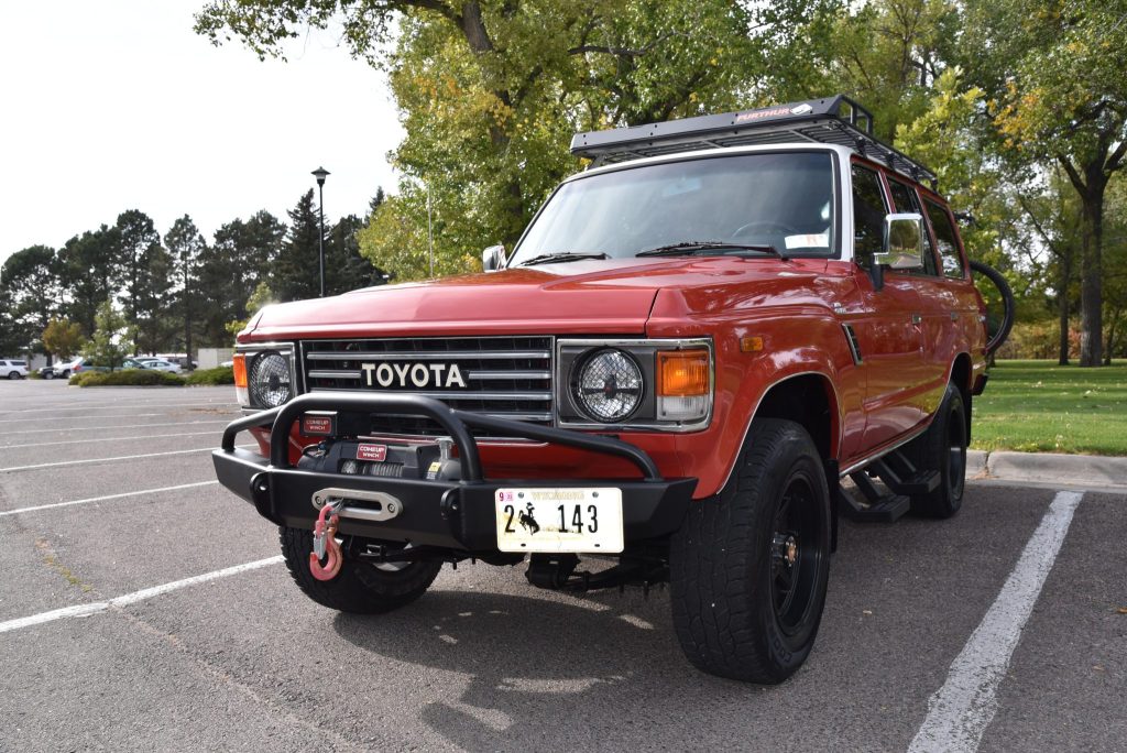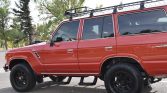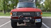 This 1987 Toyota Land Cruiser FJ60 was modified under prior ownership with a GM 5.7-liter V8 that is paired with a replacement five-speed manual transmission and a dual-range transfer case. Finished in red over black and gray vinyl, it is equipped with LED headlights, a winch, aftermarket 17″ wheels, manually-locking front hubs, lifted Old Man Emu suspension, electronic fuel injection, a roof rack, a Thule bike rack, steel bumpers, a swing-out tire carrier, air conditioning, and a Bluetooth-capable stereo.