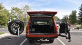Black-finished 17″ KMC XD-Series Enduro wheels are mounted with 245/70 Cooper Discoverer AT3 tires. Aisin manually-locking hubs are installed up front, and the suspension has been fitted with a 2.5″ Old Man Emu lift kit. The seller recommends that the brakes be upgraded.